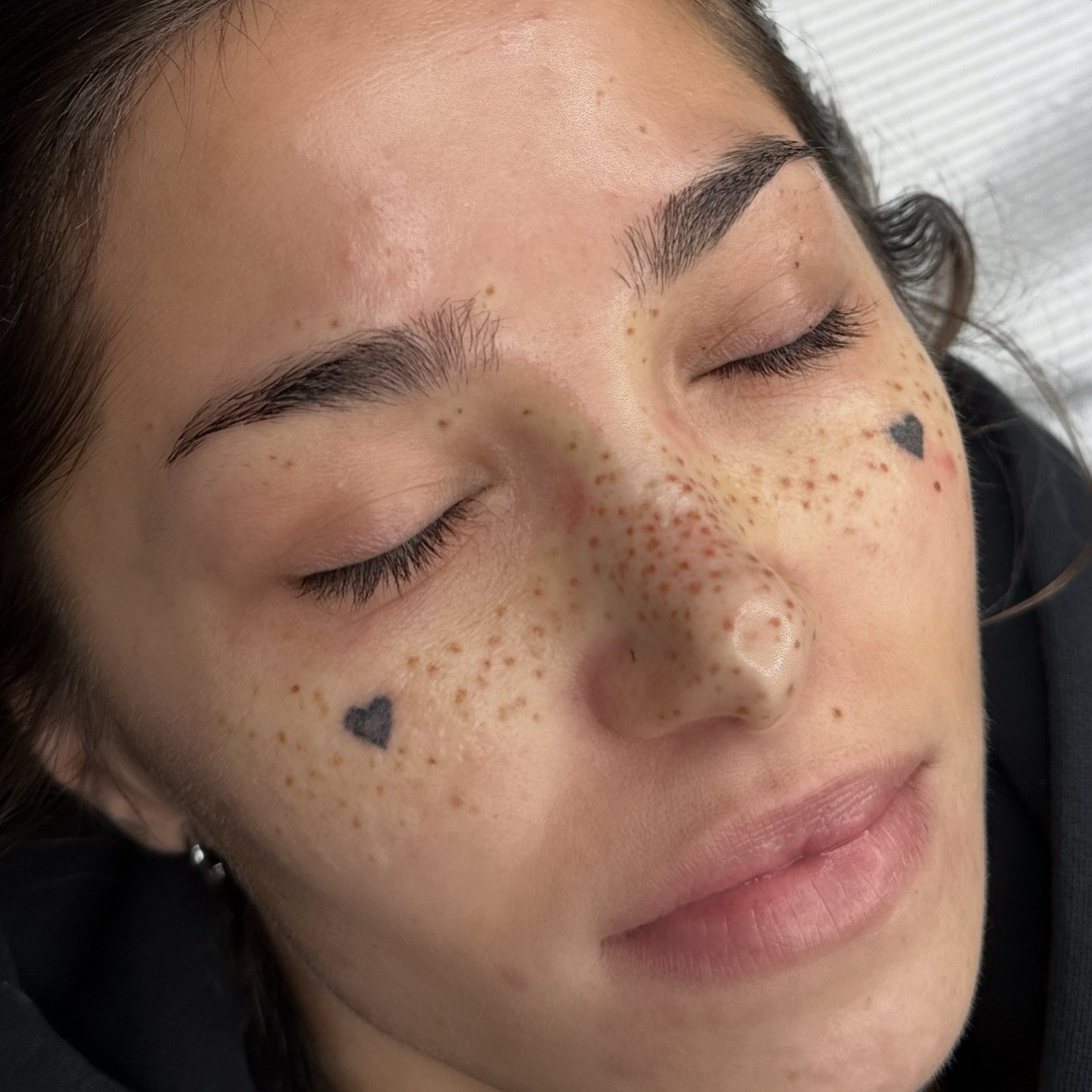 - Any makeup, skin serums, or SPF directly on tattooed freckles.
